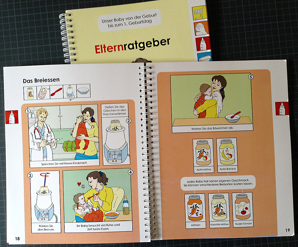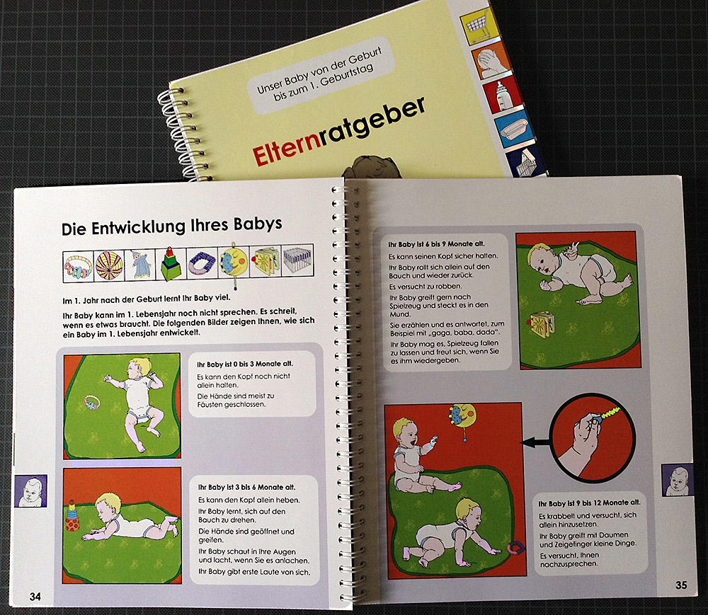 wurde der „Elternratgeber - Unser Baby von der Geburt bis zum 1. Geburtstag“ (ein Buch in Leichter Sprache), ein „Bilderbuch für Erwachsene“ für welches ich sämtliche Sach-Illustrationen schuf.